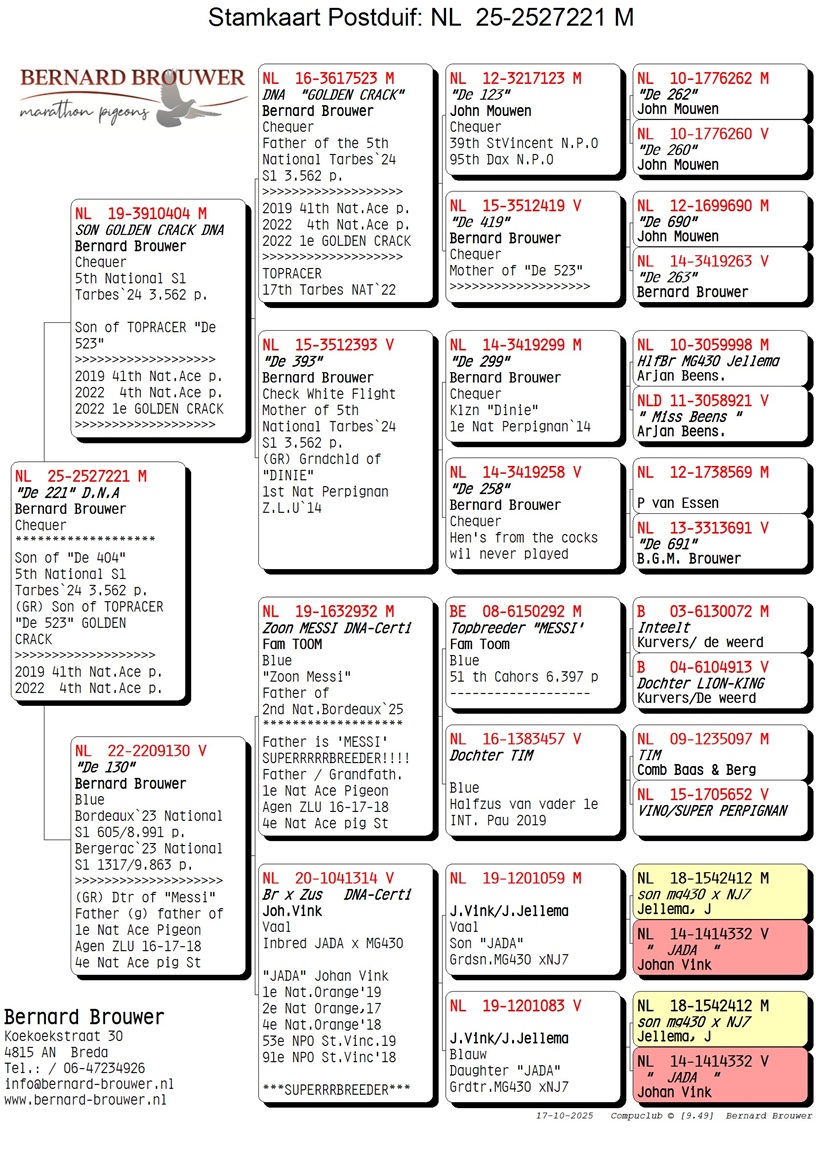 `DE 404` 5e NAT. TARBES`24. Moeder is `De 130` dochter uit `Zoon Messi`.
