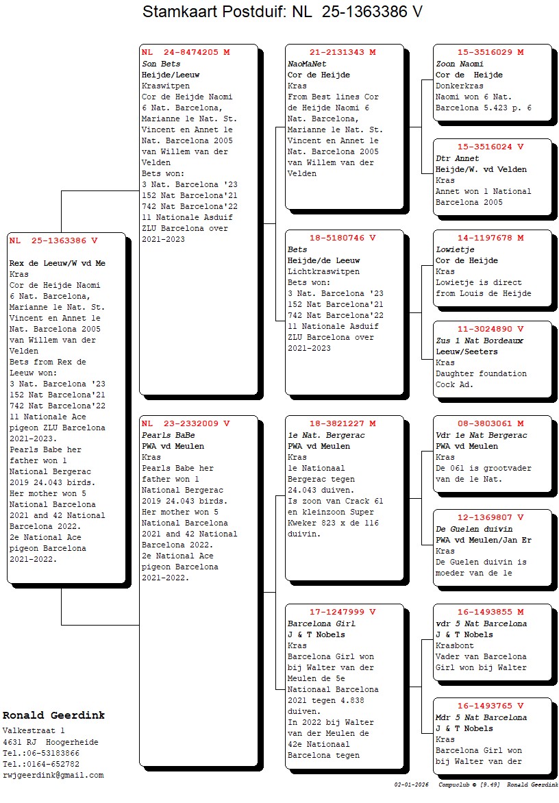Uit zoon 3e Nationaal Barcelona Rex de Leeuw x dochter 1e Nationaal Bergerac,