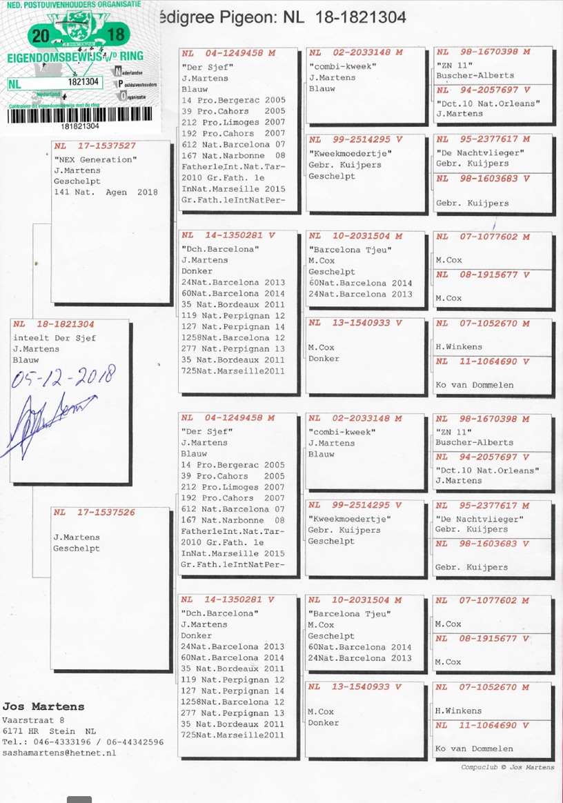 NL18-1821304 Blauw Duivin. INTEELT DER SJEF (BROER X ZUS) Rechtstr. Jos Martens. !!! TOP TOP !!! Bekijk goed de stamboom. RECHTSTREEKS JOS MARTENS.