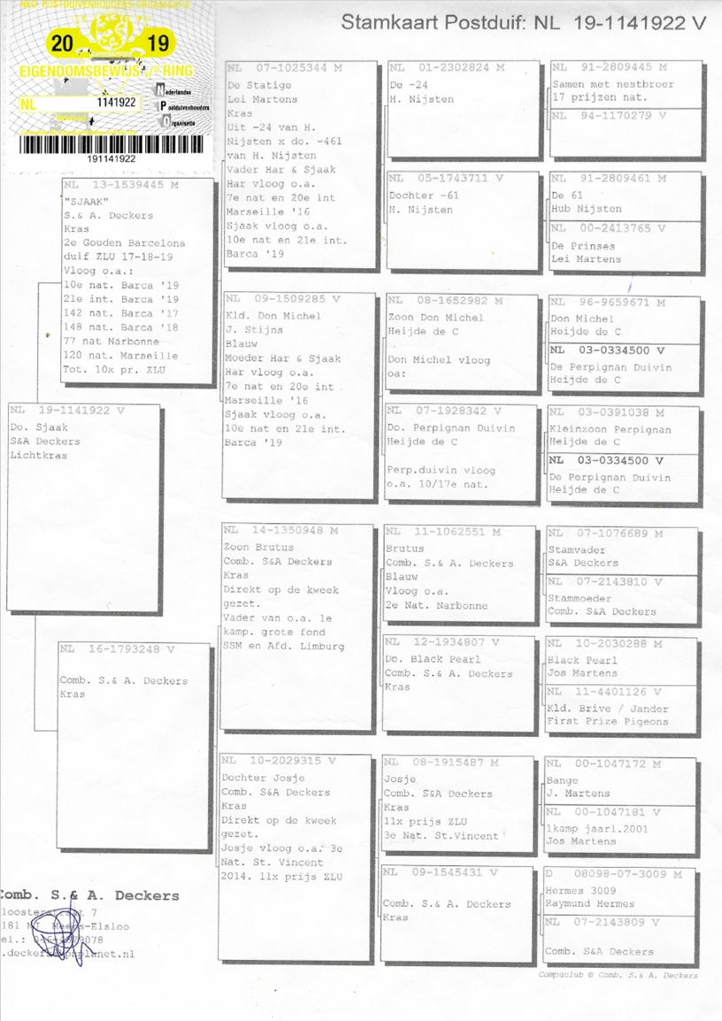 NL19-1141922 Licht Kras Duivin. Rechtstr. S. & T. Deckers. VADER IS `SJAAK` 2e Gouden Barcelona Duif ZLI 17-18-19.