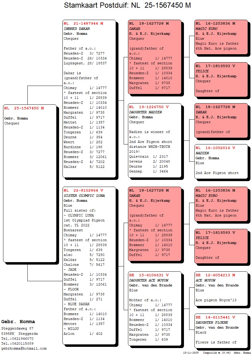 Zoon van `INTEELT DAKAR` (zoon `DAKAR` x dochter `DAKAR`) x `SISTER OLYMPIC LUNA`is dochter stamkoppel `DAKAR` x dochter `ACE NOYON`.