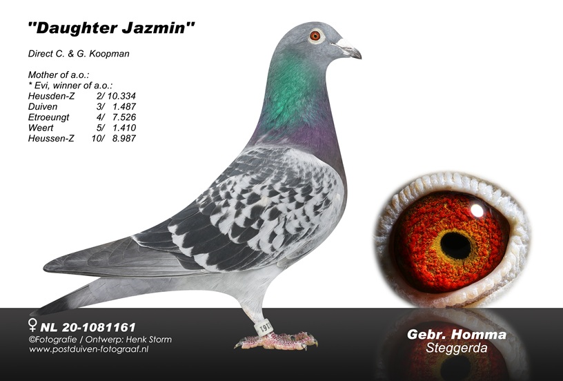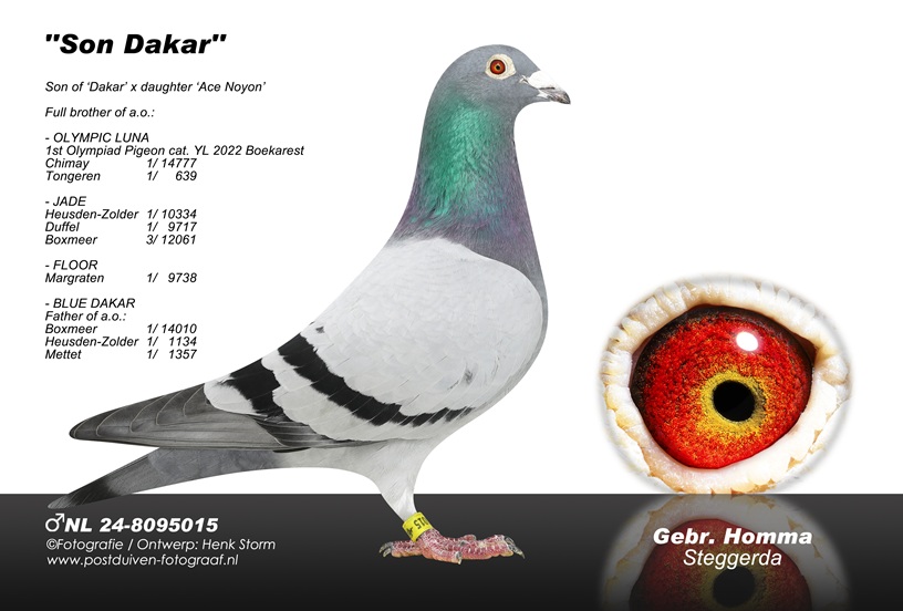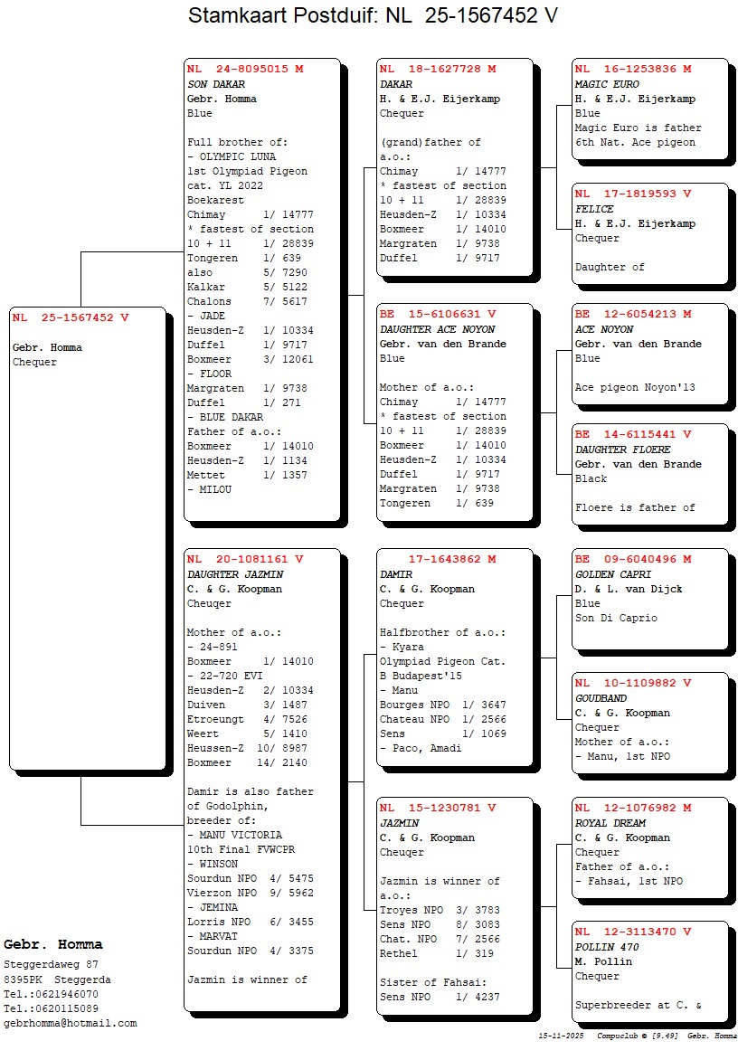 . Uit zoon stamkoppel `DAKAR` x dochter `ACE NOYON` (nestmaat `Floor` - 1e Prov.) x `dochter JAZMIN`