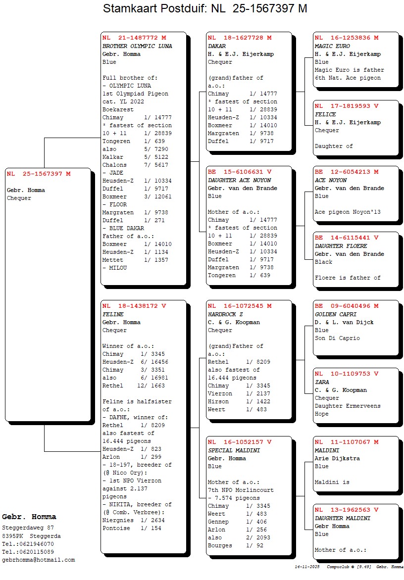 Zoon van topduivin `FELINE` (winnares 1e Chimay – 3.345 duiven) x `SON DAKAR` zoon stamkoppel `DAKAR` x dochter `ACE NOYON`
