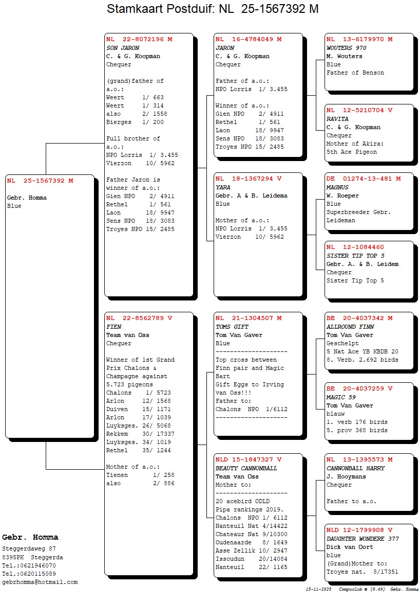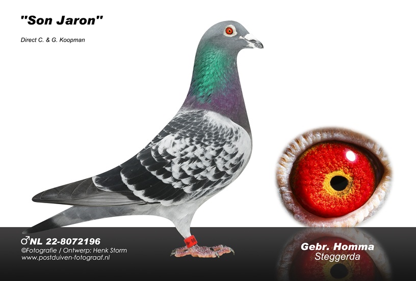 Zoon van topduivin `FIEN` (winnares 1e Prov. Grand Prix Chalons & Champagne tegen 5.985 duiven) x `SON JARON` bewezen kweker,