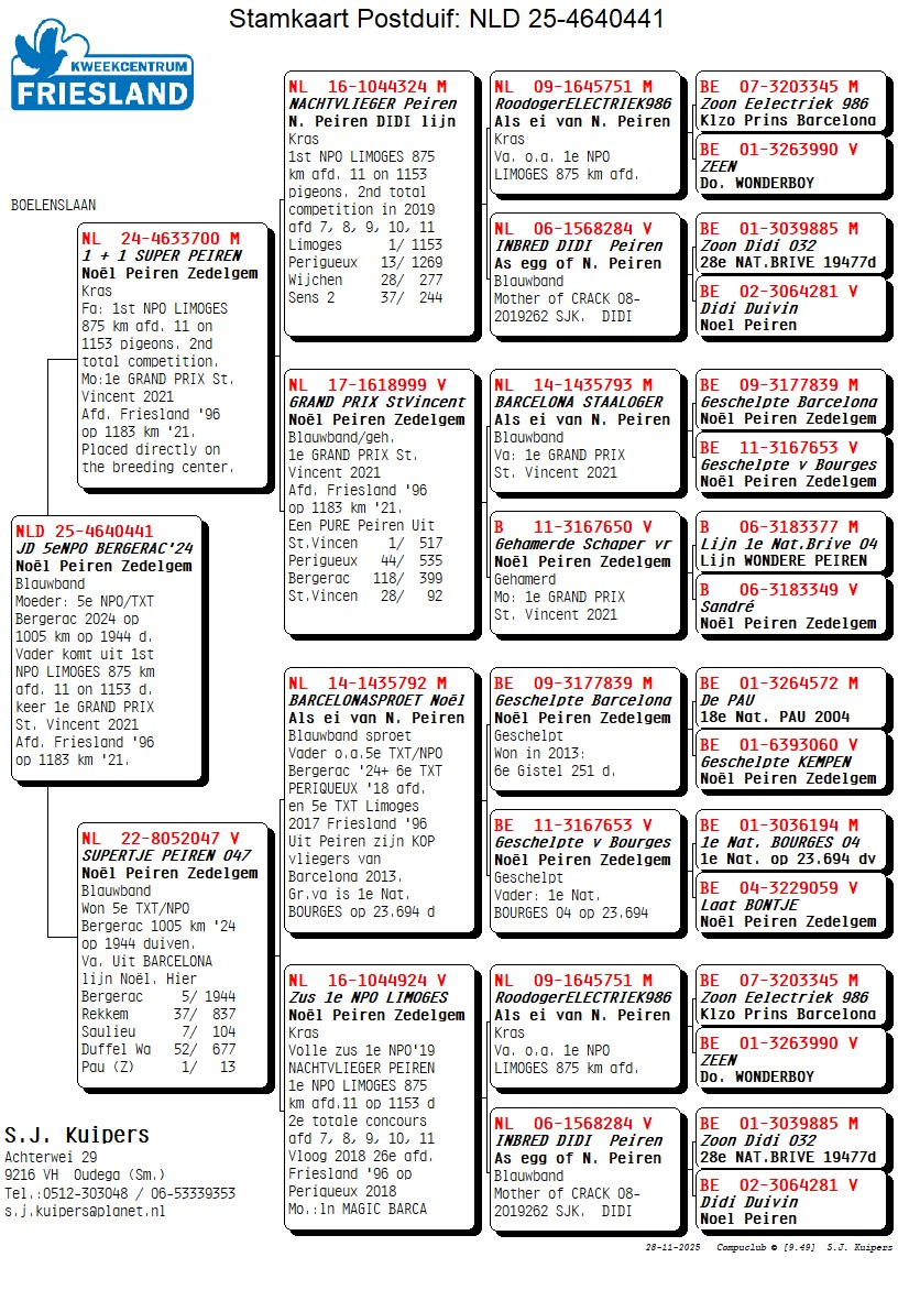 100% Noel Peiren. Vader komt uit 1st NPO LIMOGES 875 km afd. 11 keer 1e GRAND PRIX St. Vincent 2021