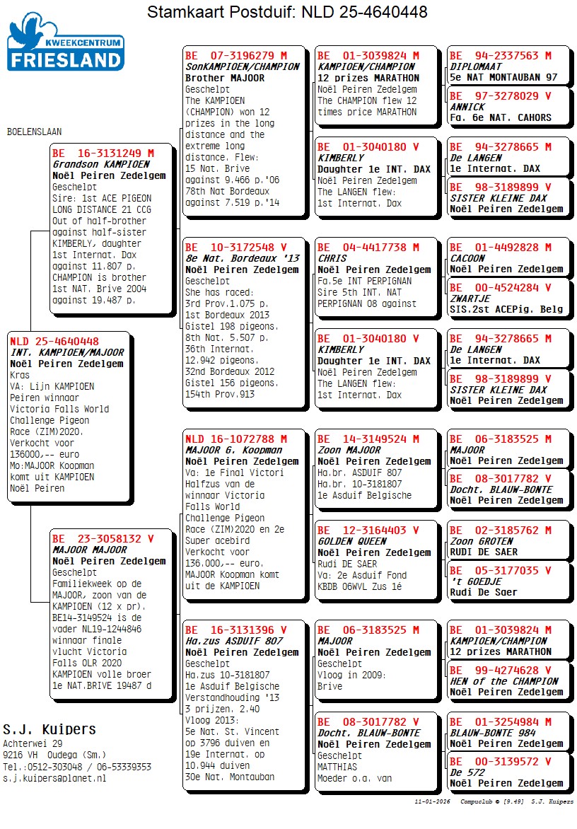 RECHTSTR. v. NOEL PEIREN uit de lijn v.d. MAJOOR en KAMPIOEN, met de vader v.d. winnaar Victoria Falls World Challenge Pigeon Race (ZIM) `20