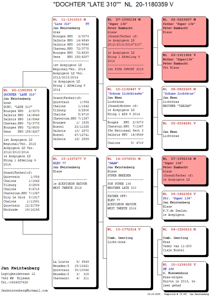 NL20-1180359 `DOCHTER LATE 310` kras duivin. Moeder van o.a. koop 3 en 9.