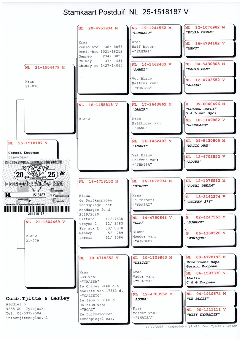 NL25-1518187 blauwe duivin, ouders rechtstreeks C. & G. Koopman, Ermerveen.