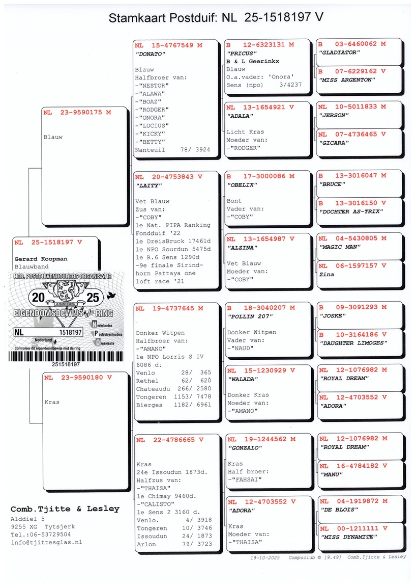 NL25-1518197 blauwe duivin, ouders rechtstreeks C. & G. Koopman, Ermerveen.