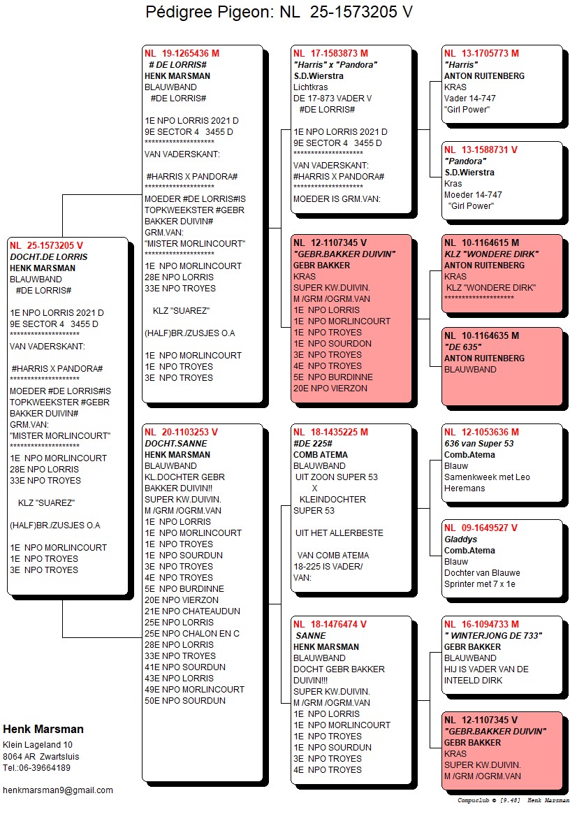 1e NPO Morlincourt,1e NPO Troyes, 3e NPO Troyes, 1e NPO, 1e SECT. 4 VIERZON. Moederskant Sanne dochter Gebr. Bakker duivin superkweker.