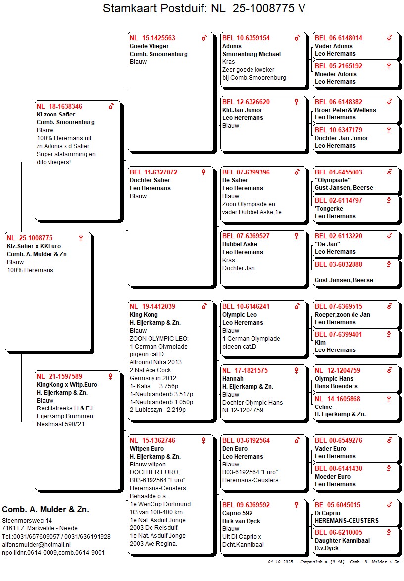 Nl25-1008775 Blauw, duivin, Heremans / Eijerkamp, vaste waarde op ons kweekhok,
