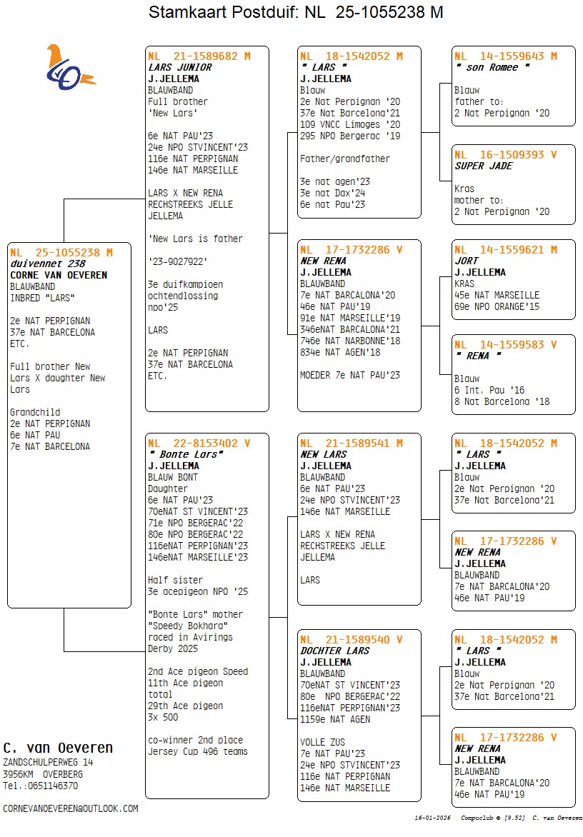 Zijn vader, Lars Junior, is een volle broer v. New Lars, winnaar van de 6e Nat. Pau. Moeder is Bonte Lars, rechtstr. do. v. New Lars, gekoppeld aan zijn eigen zus Nina.