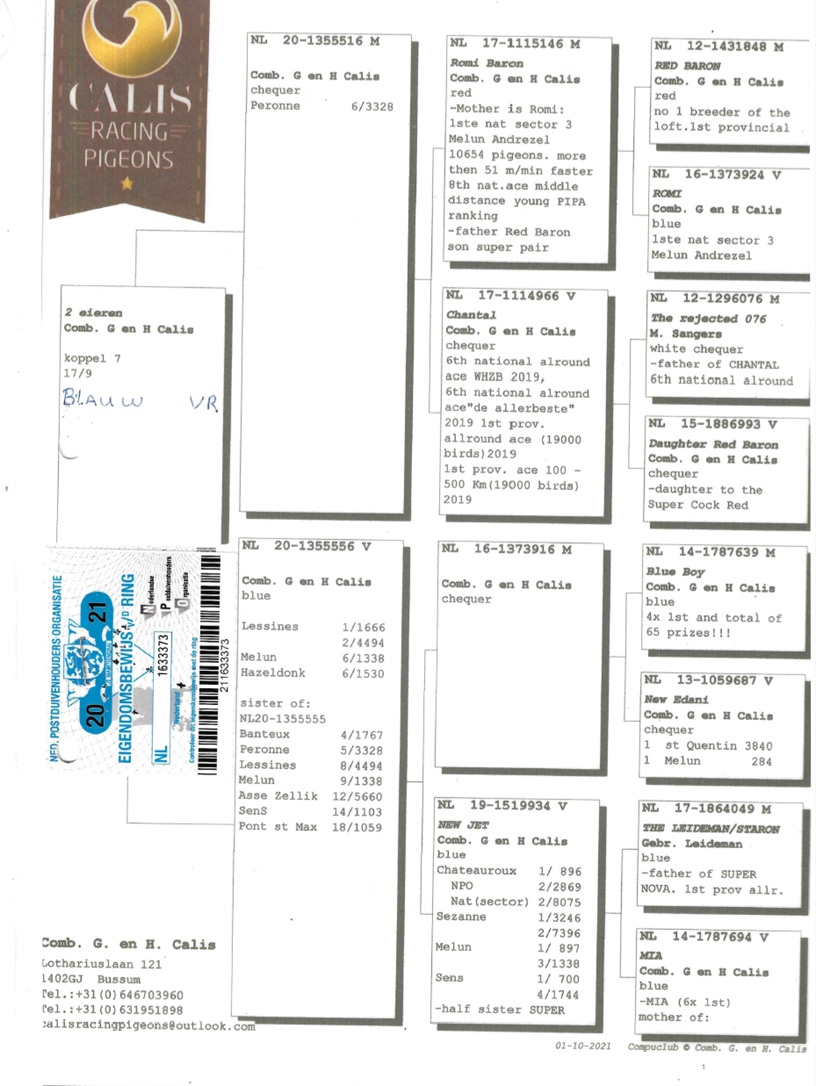 Dochter IZZY ( IZZY vloog o.a. 2X een 1e en 2e een 2e etc.). Kleindo. CHANTAL (2x 6e nat. asduif en 1e asduif afd. 7).