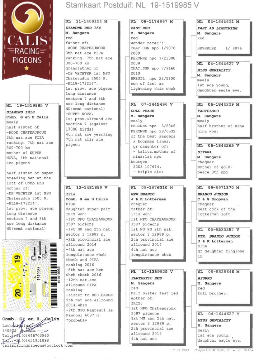 uit DIAMOND RED (ZOON FAST RED 1e, 7e en 7e NPO) x IRIS (4e nationale asduif dagfond en 1e NPO winnaar).