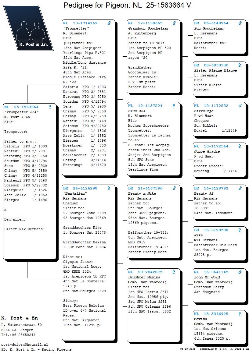 NL25-1563664 Blauwe duivin. `TROMPETTER 664`. Deze parel komt rechtstreeks uit stamdoffer en supervererver Trompetter!!!