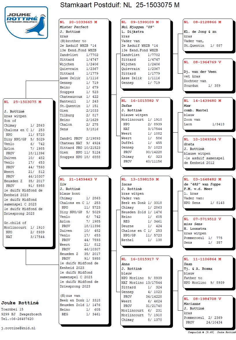 uit MISTER PERFECT maal LIV 1e PRIJSWINNAAR in grootverband en TT duif.